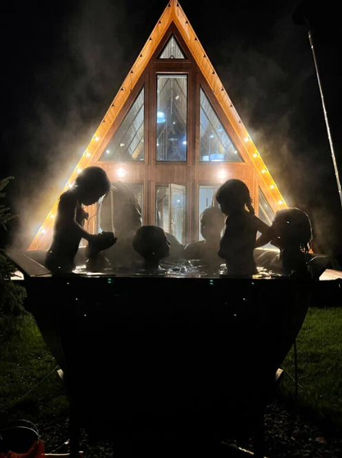В нашем чане комфортно разместятся 3-4 человека. Вода в чан заливается из собственной скважины, фильтруется и используется только один раз. Моется после каждого применения.
