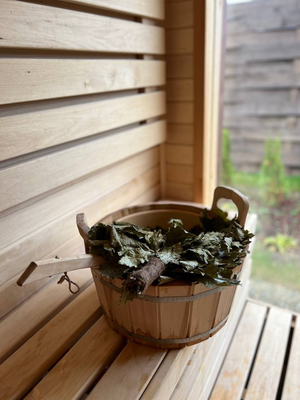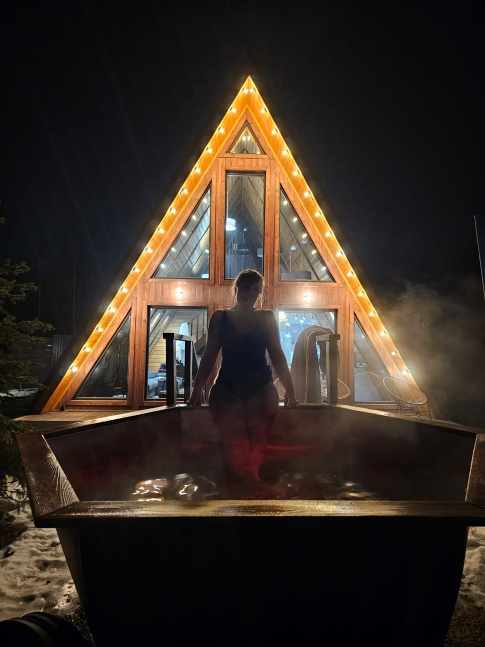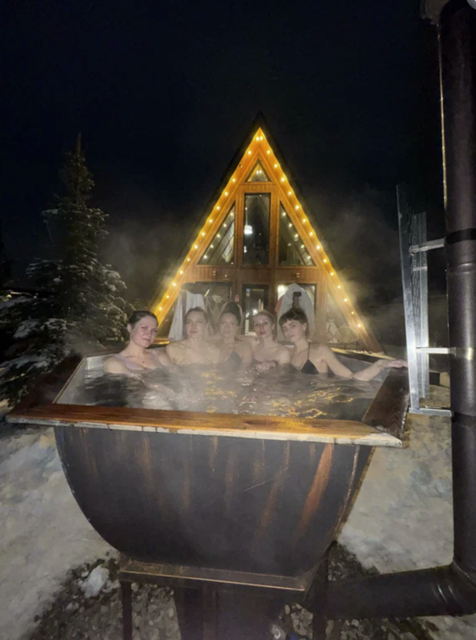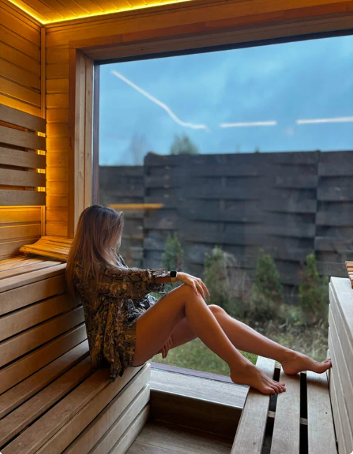 Баня с панорамным окном внутри каждого дома. Уличный чан подогревается на огне