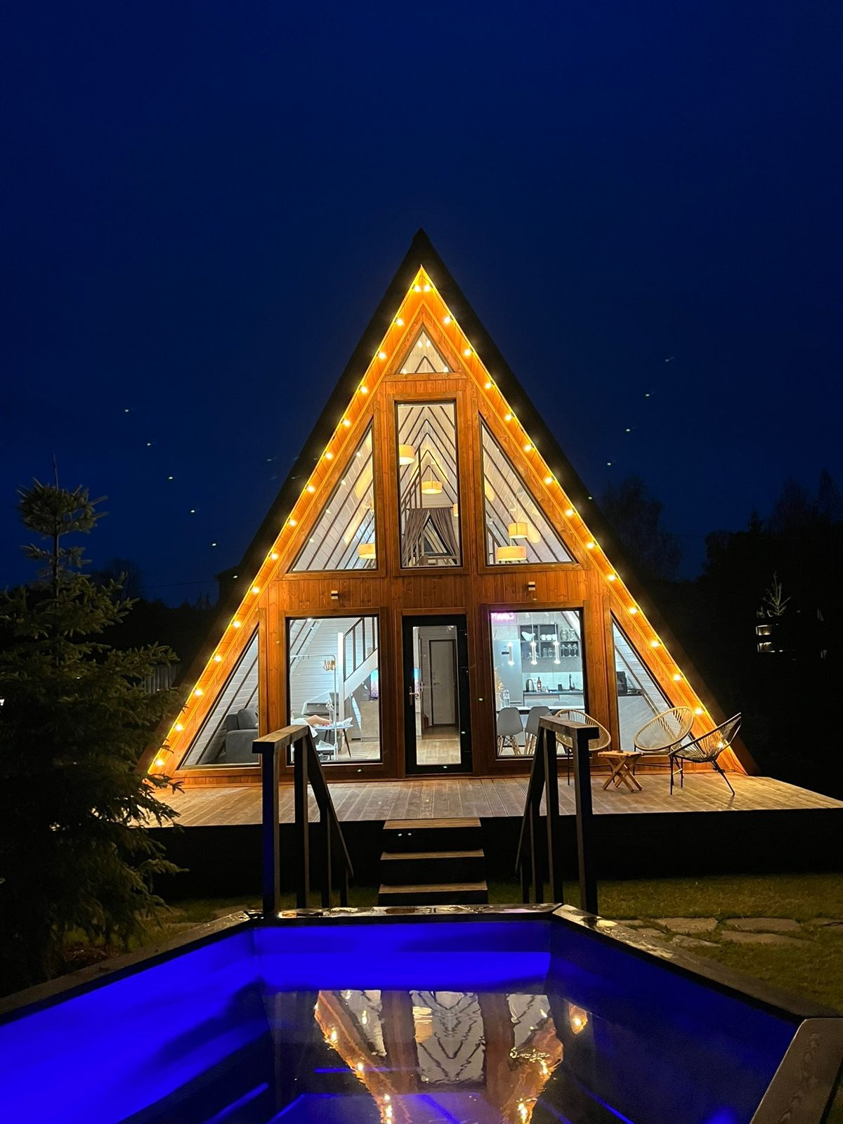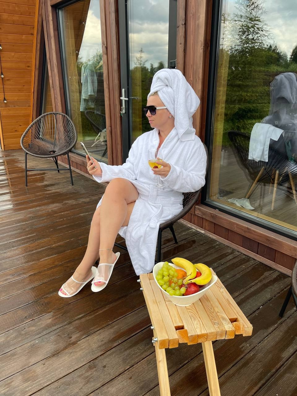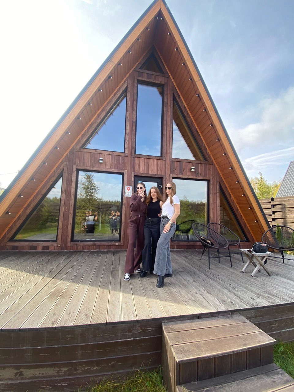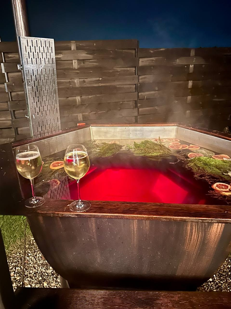 Баня с панорамным окном внутри каждого дома. Уличный чан подогревается на огне