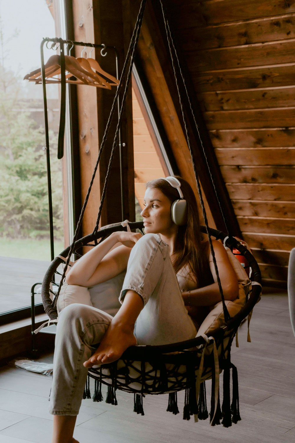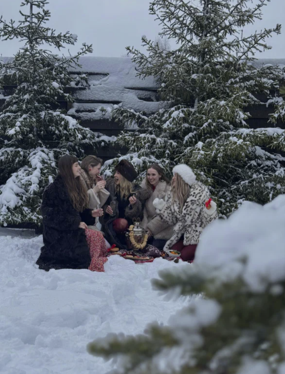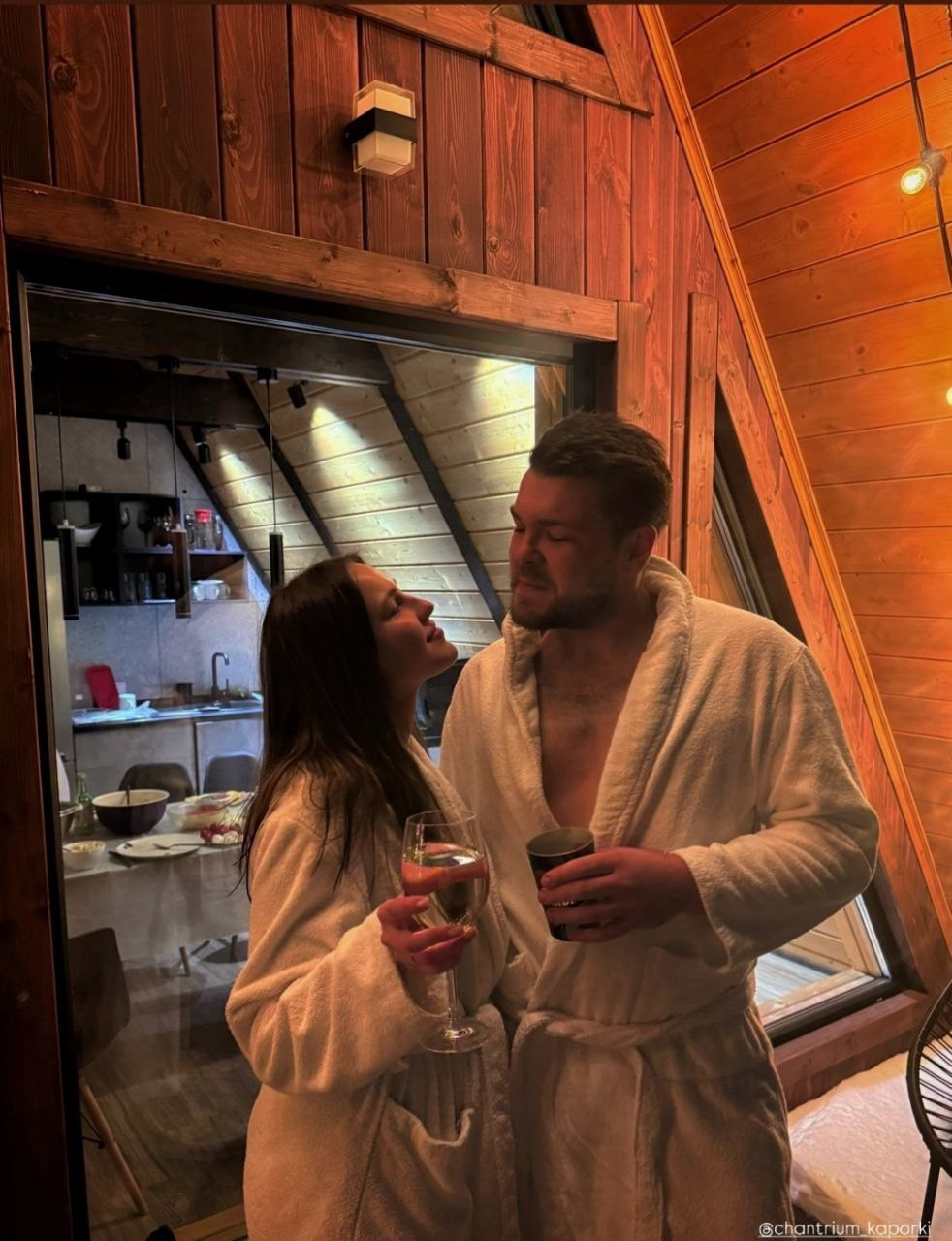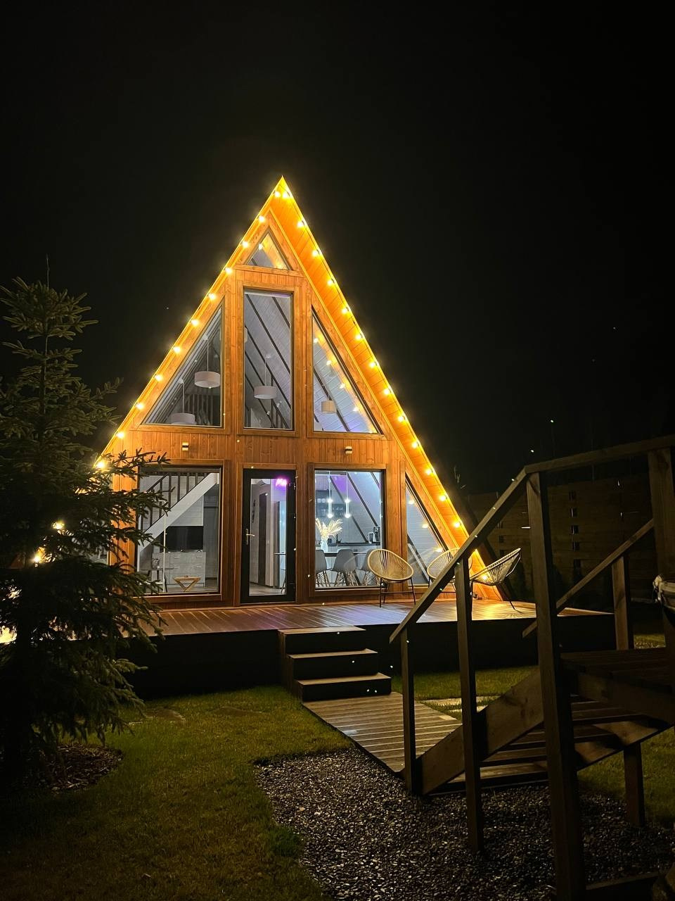 Баня с панорамным окном внутри каждого дома. Уличный чан подогревается на огне